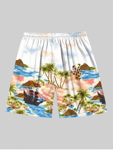 Plus Size Coconut Tree Sea Sailboat Print Hawaii Drawstring Beach Shorts For Men - White - 7xl