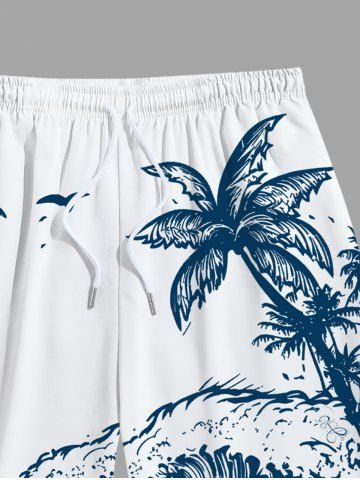 Plus Size Coconut Tree Sea Wave Bird Print Hawaii Drawstring Beach Shorts For Men - White - M