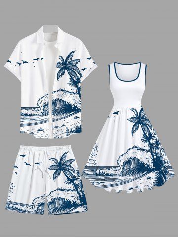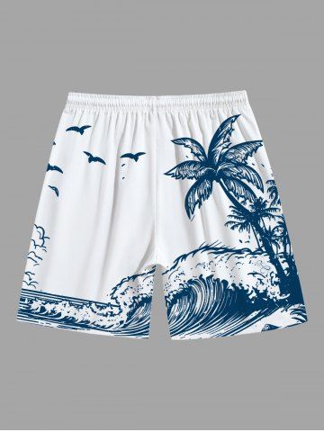 Plus Size Coconut Tree Sea Wave Bird Print Hawaii Drawstring Beach Shorts For Men - White - 4xl