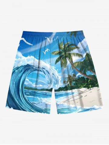 Plus Size Coconut Tree Sea Waves Beach Print Hawaii Drawstring Pocket Beach Shorts For Men - Blue - 5xl