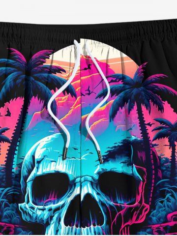 Plus Size Coconut Tree Skull Mountain Cave Print Hawaii Ombre Drawstring Beach Shorts For Men - Black - 4xl