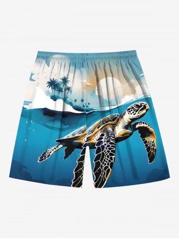 Plus Size Coconut Tree Sun Sea Turtle Print Hawaii Sea Creatures Drawstring Beach Shorts For Men - Blue - L