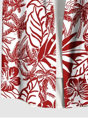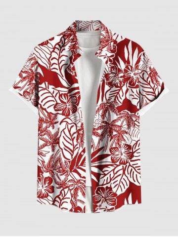 Plus Size Coconut Tree Tropical Leaf Hibiscus Flower Print Hawaii Button Pocket Shirt For Men - Red - 3xl