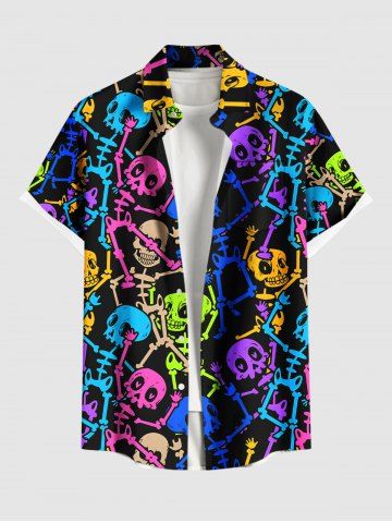 Plus Size Colorful Skeleton Print Hawaii Button Pocket Shirt For Men - Black - 4xl