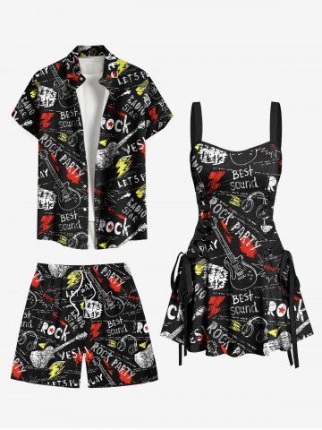 Plus Size Earphone Lightning Guitar Letters Print Hawaii Rock and Roll Drawstring Beach Shorts For Men - Black - M