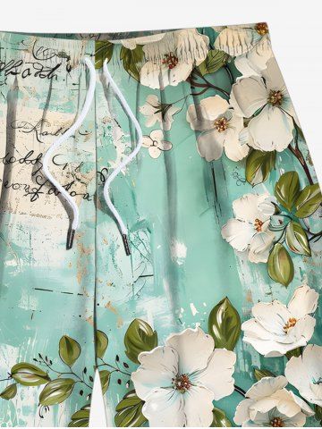 Plus Size Floral Leaf Branch Print Hawaii Drawstring Beach Shorts For Men - Light Green - 4xl