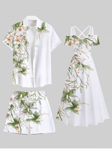 Plus Size Flower Leaf Branch Print Hawaii Drawstring Beach Shorts For Men - White - M