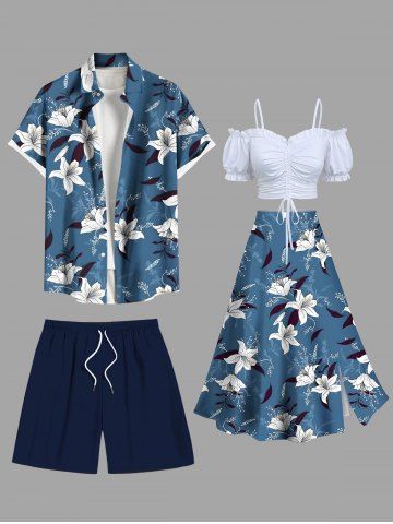 Plus Size Flower Leaf Branch Print Hawaii Drawstring Beach Shorts For Men - Blue - L