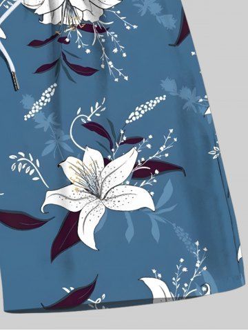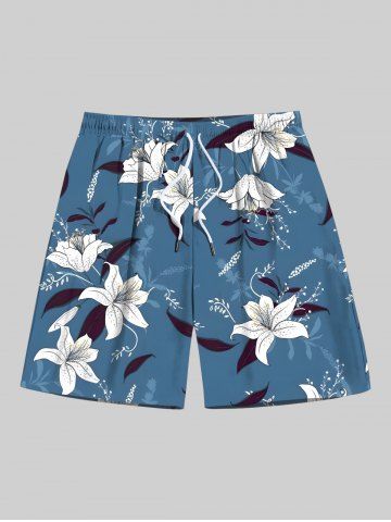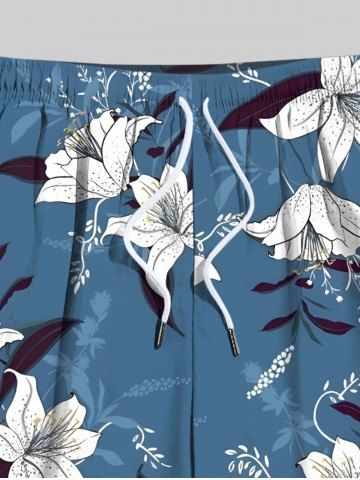 Plus Size Flower Leaf Branch Print Hawaii Drawstring Beach Shorts For Men - Blue - 4xl