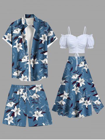 Plus Size Flower Leaf Branch Print Hawaii Drawstring Beach Shorts For Men - Blue - 6xl