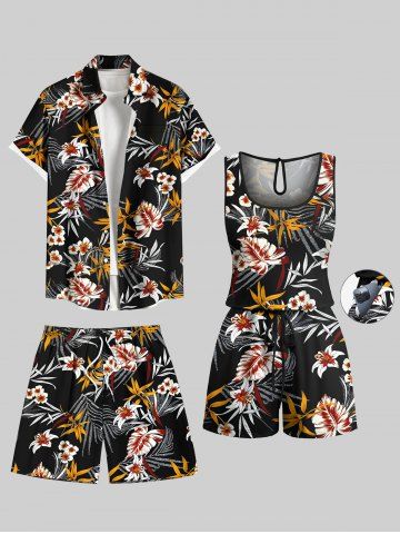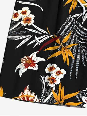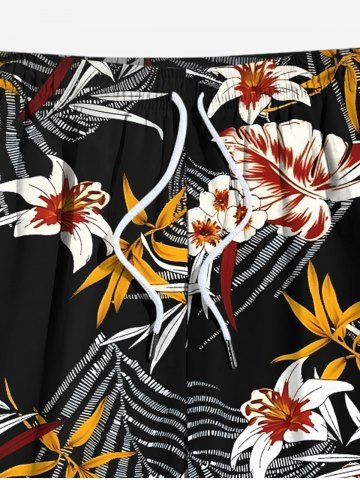 Plus Size Flower Tropical Leaf Print Hawaii Drawstring Beach Shorts For Men - Black - L
