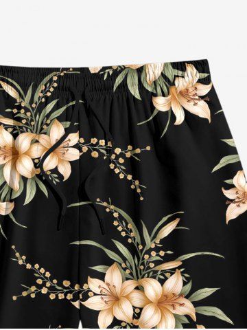 Plus Size Flower Leaf Branch Print Hawaii Drawstring Beach Shorts For Men - Black - L