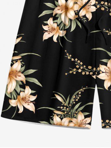Plus Size Flower Leaf Branch Print Hawaii Drawstring Beach Shorts For Men - Black - 4xl