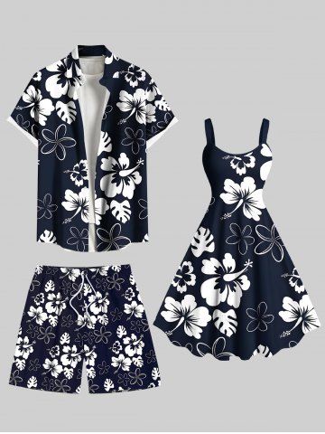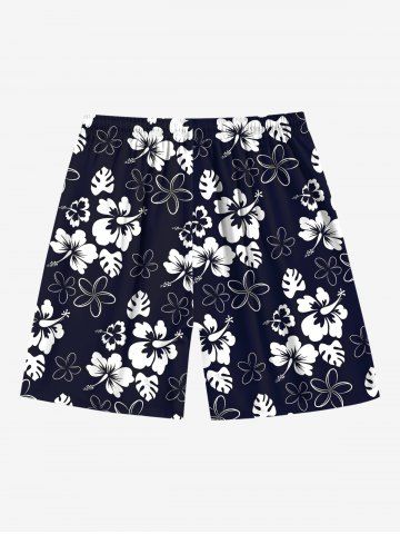 Plus Size Hibiscus Flower Print Hawaii Drawstring Beach Shorts For Men - Black - Xl