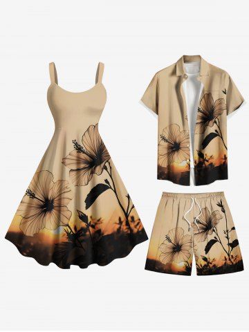 Shorts > Plus Size Hibiscus Flower Ombre Sunset Print Hawaii Drawstring Pocket Beach Shorts For Men