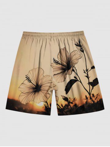 Shorts > Plus Size Hibiscus Flower Ombre Sunset Print Hawaii Drawstring Pocket Beach Shorts For Men