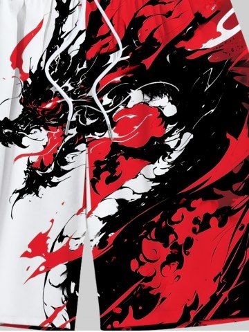 Plus Size Ink Painting Dragon Print Hawaii Drawstring Beach Shorts For Men - Red - 2xl