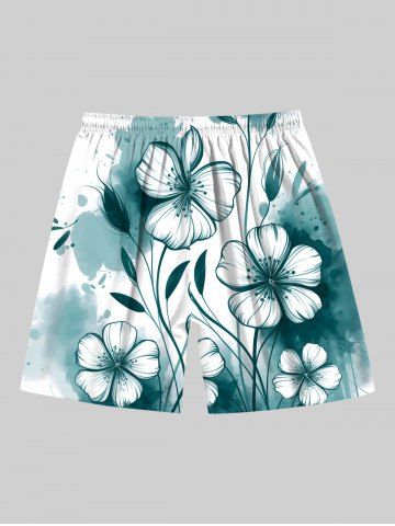 Shorts > Plus Size Ink Painting Watercolor Flower Print Hawaii Drawstring Beach Shorts For Men