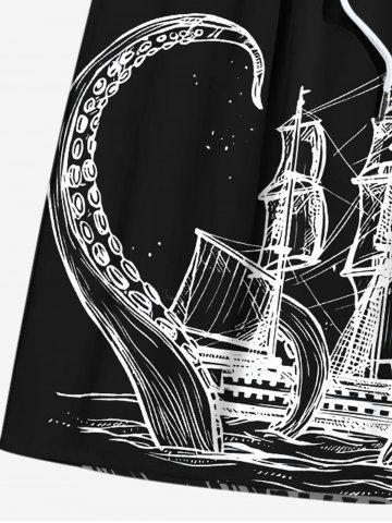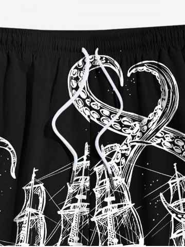 Plus Size Octopus Sailboat Two Tone Print Hawaii Cruise Drawstring Beach Shorts For Men - Black - 8xl