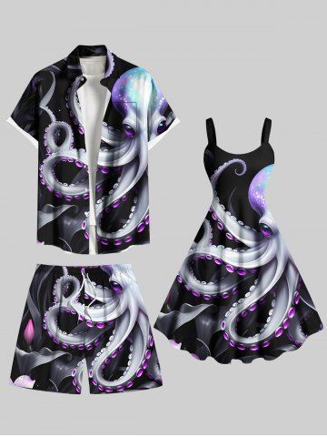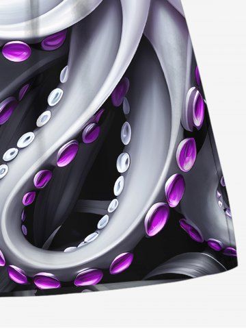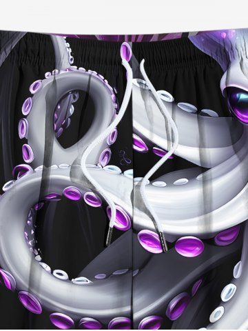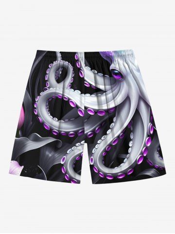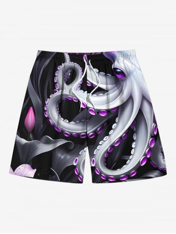 Plus Size Octopus Tropical Leaf Print Hawaii Drawstring Beach Shorts For Men - Black - L