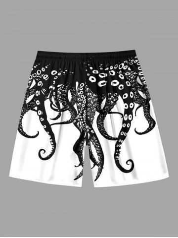 Plus Size Octopus Two Tone Print Hawaii Drawstring Beach Shorts For Men - Black - 3xl