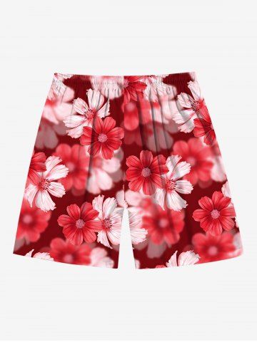 Plus Size Ombre Daisy Flower Print Hawaii Drawstring Pocket Beach Shorts For Men - Red - L