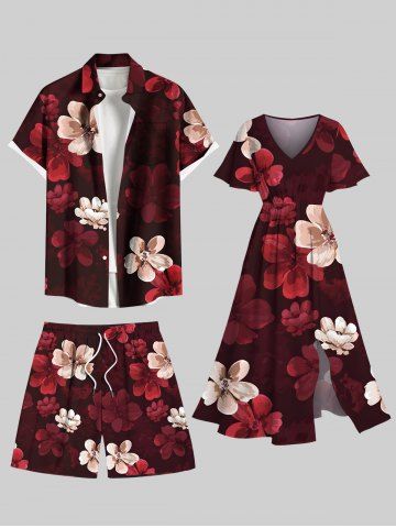 Plus Size Ombre Flower Print Hawaii Drawstring Beach Shorts For Men - Deep Red - 3xl
