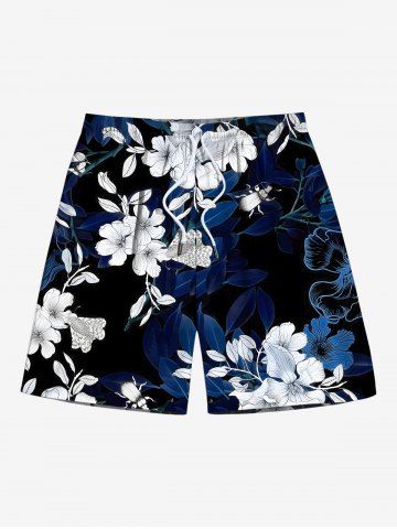 Plus Size Ombre Hibiscus Flower Leaf Branch Print Hawaii Drawstring Beach Shorts For Men - Blue - 3xl