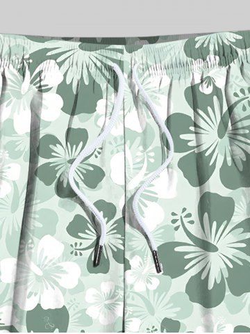 Plus Size Ombre Hibiscus Flower Print Hawaii Drawstring Pocket Beach Shorts For Men - Light Green - M