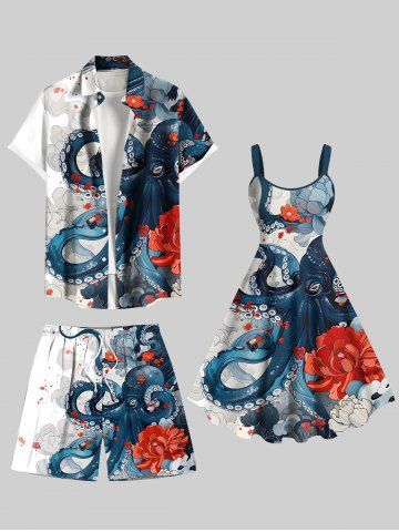 Shorts > Plus Size Ombre Octopus Flower Print Hawaii Drawstring Beach Shorts For Men