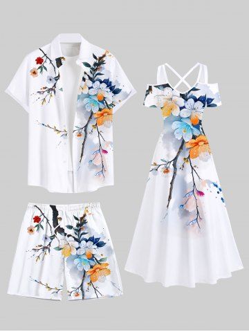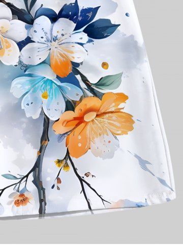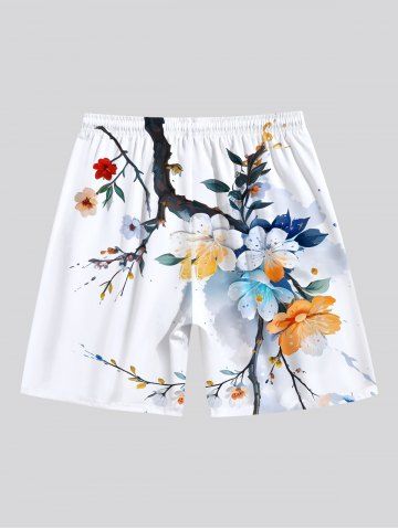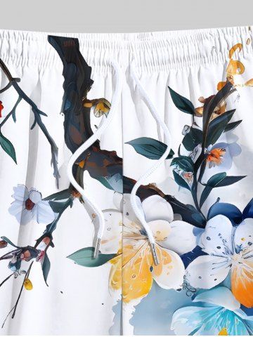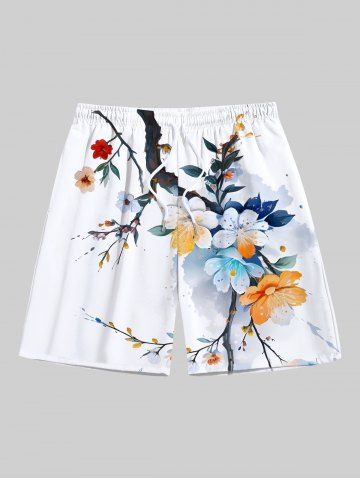 Plus Size Ombre Watercolor Floral Leaf Branch Print Hawaii Drawstring Beach Shorts For Men - White - 2xl