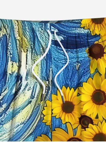 Shorts > Plus Size Painting Sunflower Print Hawaii Drawstring Beach Shorts For Men