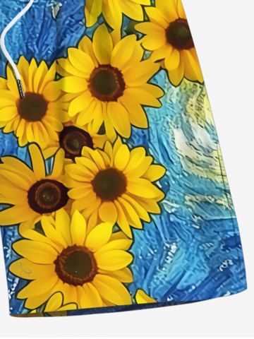 Plus Size Painting Sunflower Print Hawaii Drawstring Beach Shorts For Men - Blue - 4xl