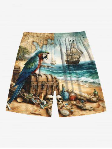 Plus Size Parrot Sea Sailboat Jewelry Skull Print Hawaii Drawstring Beach Shorts For Men - Yellow - L