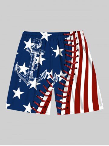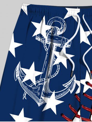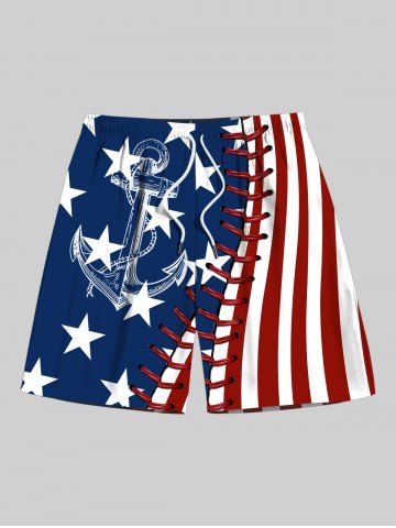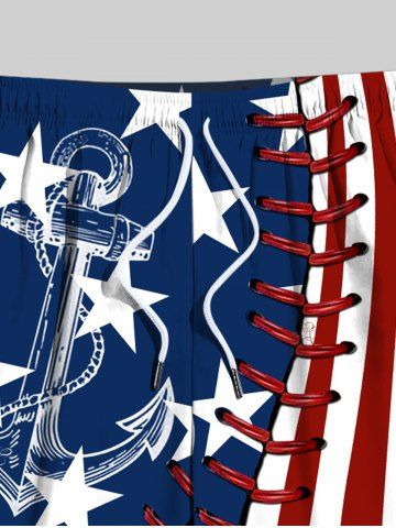 Plus Size Patriotic American Flag Anchor 3D Topstitching Print Hawaii Cruise Drawstring Beach Shorts For Men - Blue - 3xl