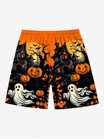 Plus Size Pumpkin Ghost Bat Tree Castle Print Halloween Drawstring Pocket Beach Shorts For Men - Orange - 6xl