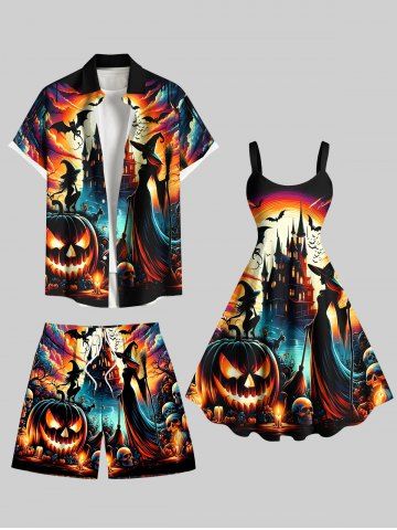 Shorts > Plus Size Pumpkin Wizard Bat Castle Print Halloween Drawstring Pocket Beach Shorts For Men