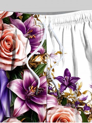 Plus Size Rose Flower Leaf Print Hawaii Drawstring Pocket Beach Shorts For Men - White - 2xl