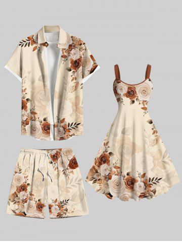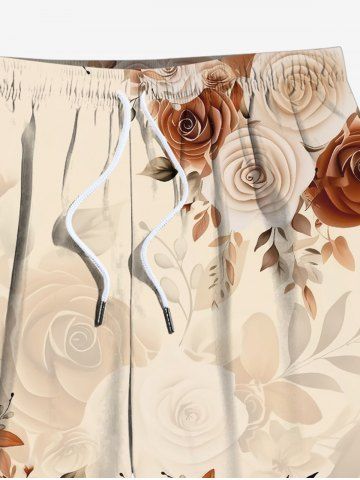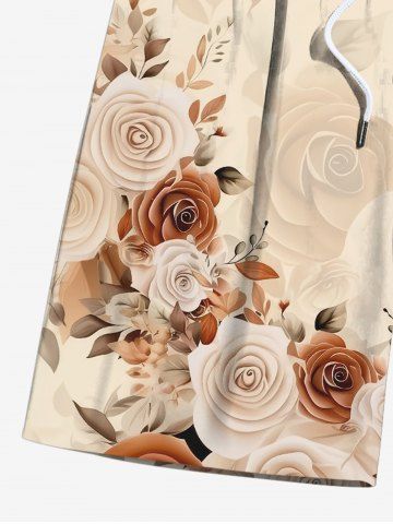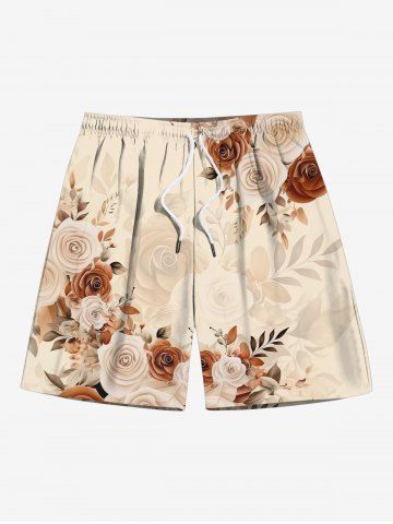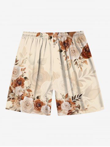 Plus Size Rose Flower Leaf Print Hawaii Ombre Drawstring Beach Shorts For Men - Light Coffee - Xl