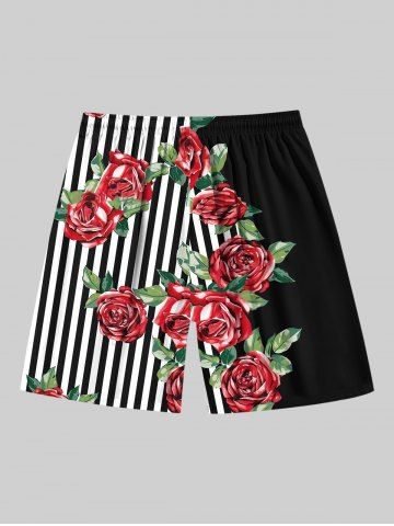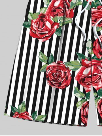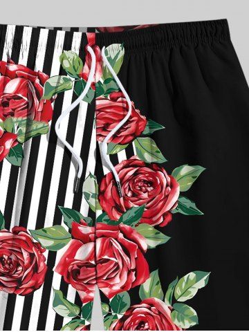 Plus Size Rose Flower Leaf Striped Print Hawaii Drawstring Beach Shorts For Men - Black - 3xl