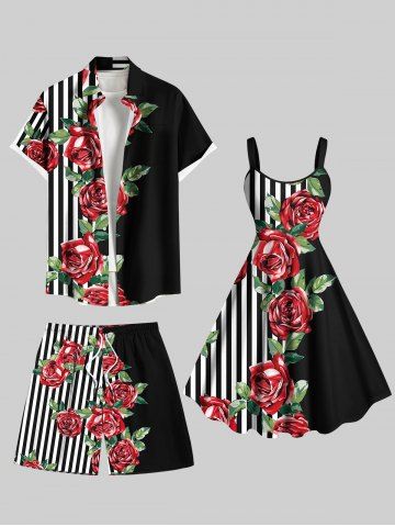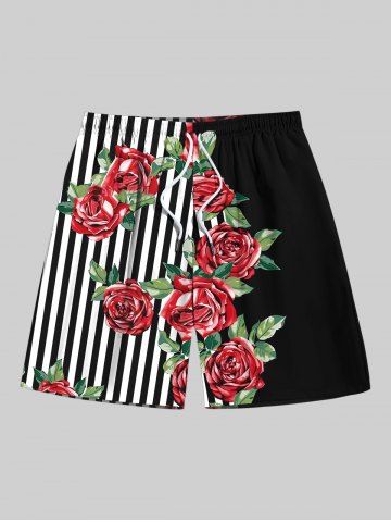 Plus Size Rose Flower Leaf Striped Print Hawaii Drawstring Beach Shorts For Men - Black - 5xl