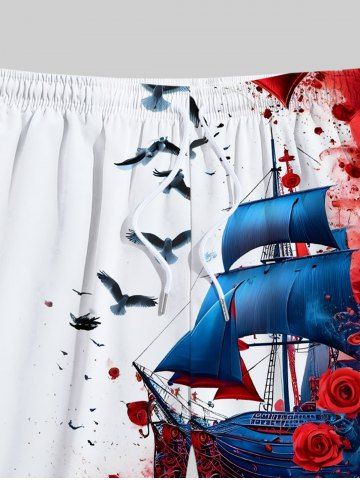 Plus Size Rose Flower Sailboat Bird Tie Dye Cruise Print Hawaii Drawstring Beach Shorts For Men - White - 5xl