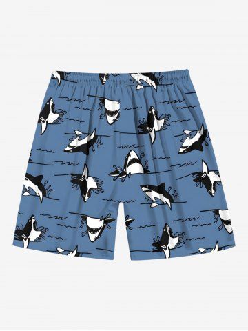 Plus Size Sea Waves Shark Print Hawaii Drawstring Beach Shorts For Men - Deep Blue - M