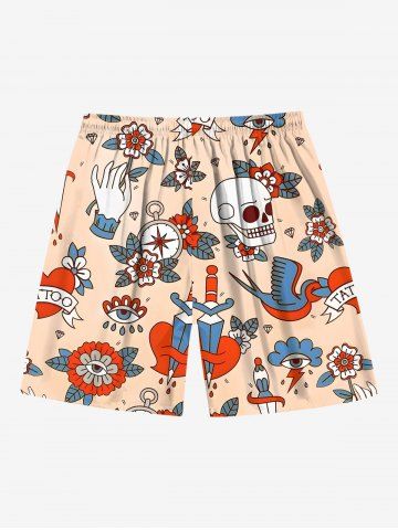 Plus Size Skull Flower Sword Heart Eye Bird Print Hawaii Drawstring Beach Shorts For Men - Apricot - 4xl