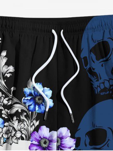 Plus Size Skull Flower Leaf Branch Print Hawaii Drawstring Pocket Beach Shorts For Men - Black - 2xl