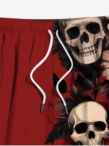 Plus Size Skull Hibiscus Flower Leaf Print Halloween Drawstring Beach Shorts For Men - Red - 2xl