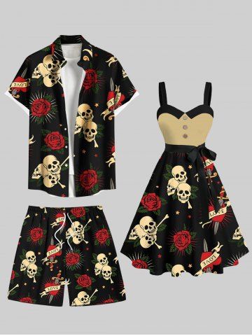 Plus Size Skull Rose Flower Heart Sword Print Halloween Drawstring Beach Shorts For Men - Black - 7xl