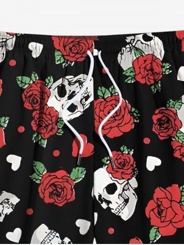 Plus Size Skull Rose Flower Leaf Heart Print Hawaii Drawstring Beach Shorts For Men - Black - 2xl