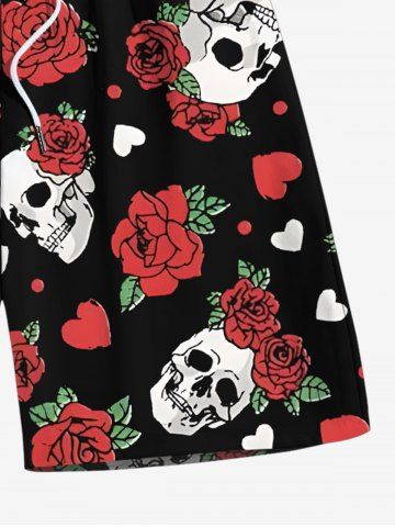 Plus Size Skull Rose Flower Leaf Heart Print Hawaii Drawstring Beach Shorts For Men - Black - 3xl