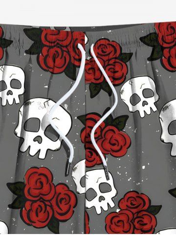 Plus Size Skull Rose Flower Print Hawaii Drawstring Beach Shorts For Men - Dark Gray - M